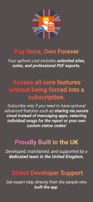 Indiferent dacă ești manager de șantier, antreprenor general, inspector H&S, dezvoltator imobiliar sau pur și simplu un proprietar care își renovează casa, SITE REPORT este conceput pentru a răspunde nevoilor tale specifice. Profesioniștii aleg SITE REPORT pentru simplitatea sa remarcabilă – fără configurări complexe sau sesiuni de training. Este rapid, generând liste de verificări complete și rapoarte profesionale în câteva secunde, nu ore. Fiabil, funcționând impecabil offline, garantând că nu vei pierde niciodată date critice. Și, esențial, este accesibil, oferind o achiziție unică în locul abonamentelor costisitoare. Pentru cei ce doresc funcționalități extinse, o subscripție opțională de tip Premium deblochează stocarea în cloud și personalizări avansate. Cu actualizări constante și suport dedicat, SITE REPORT continuă să fie instrumentul preferat pentru echipele care prețuiesc eficiența și profesionalismul.